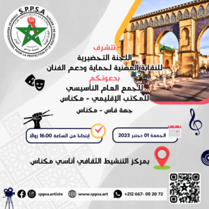 تم يوم الجمعة 01 دجنبر على الساعة الرابعة زوالا تأسيس المكتب الإقليمي مكناس جهة فاس مكناس من طرف أعضاء اللجنة التحضيرية بحضور أعضاء النقابة المهنية لحماية ودعم الفنان المنتسبين لجهة فاس مكناس
